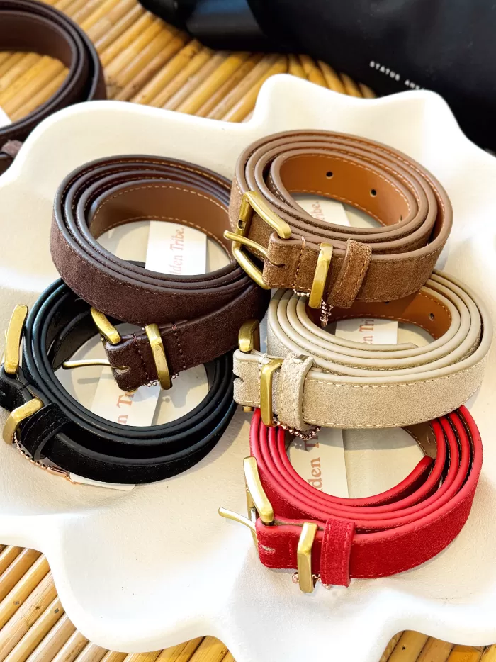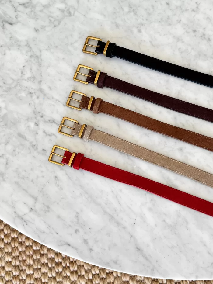 Crafted from suede, the Suede Belt is an elevated classic to add your wardrobe. The belt is minimalist in style with a slim silhouette, and features a premium brass buckle. Style it with tailoring or denim and complete with our other suede accessories. Available in 5 colourways