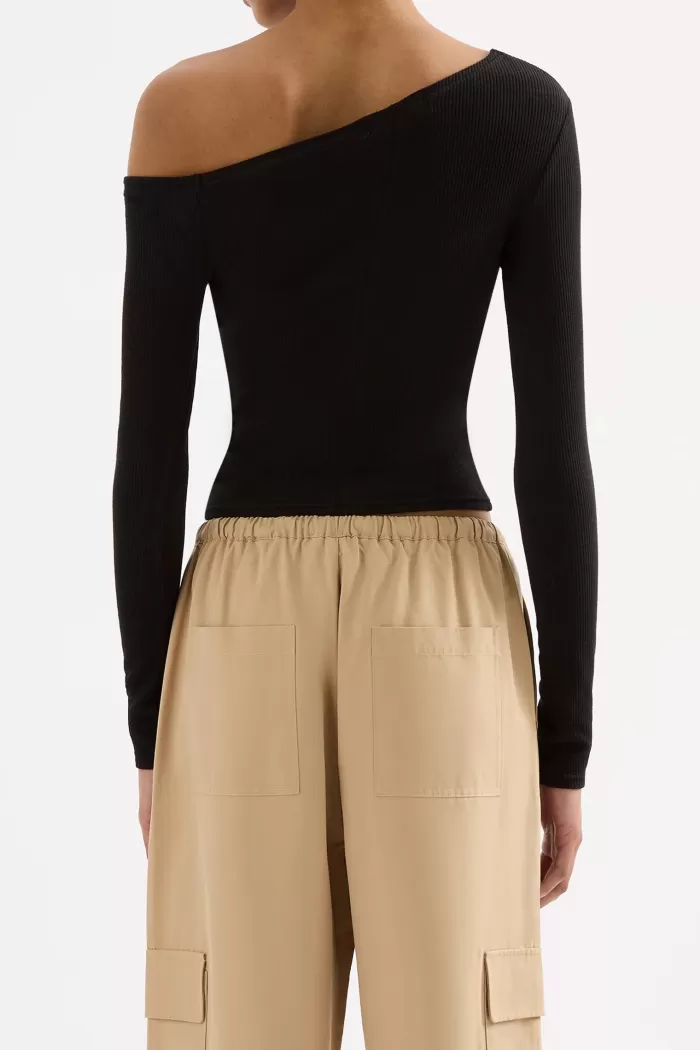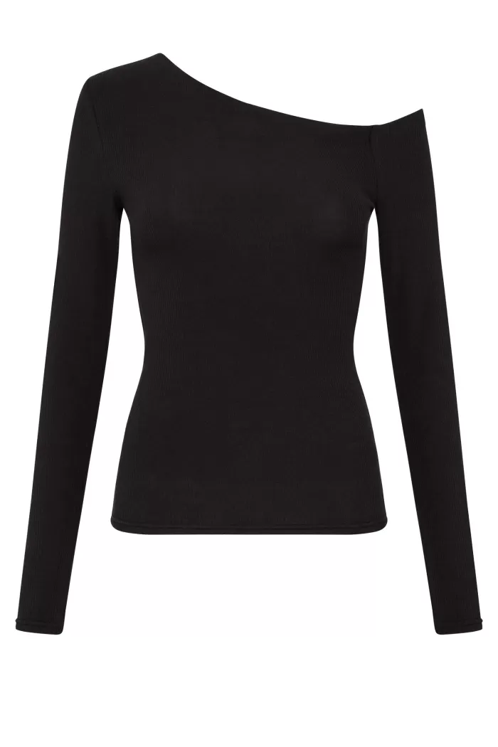The Kyan Top is made in organic cotton and has a small rib finish. The silhouette is a flattering close fit that is off the shoulder and finishes above the hips. Features include long fitted sleeves and gathered detail on shoulder.