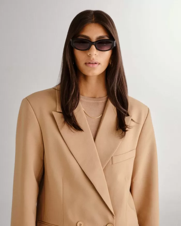 The Juliet is a slim cat eye frame which is inspired by the 90’s. It features signature gold initial hardware on the temples of the frame which elevates its design. Handcrafted with premium black bio-acetate and paired with a smoke gradient lens. It is giving model off duty vibes.