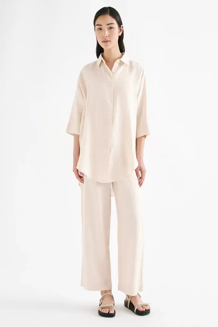 The Lounge Linen Longline Shirt is made in a premium 100% organic French linen which has been washed down for a soft and breathable handfeel. The silhouette is relaxed and oversized with a long billowing hemline and side slits. Features include classic shirt detailing with collared neckline, button front opening, 3/4 sleeves and a Nude Lucy branded label. This Longline Shirt can be worn by itself or paired with a Nude Lounge bottom.